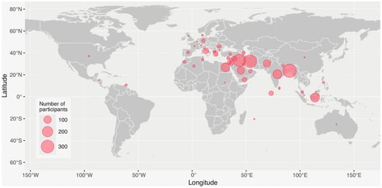 Geographical distribution of participants in the TIF’s international thalassaemia collaborative assessment survey, created using the ggplot2 package in “R”. The circle radius represents the number of survey participants from each country.