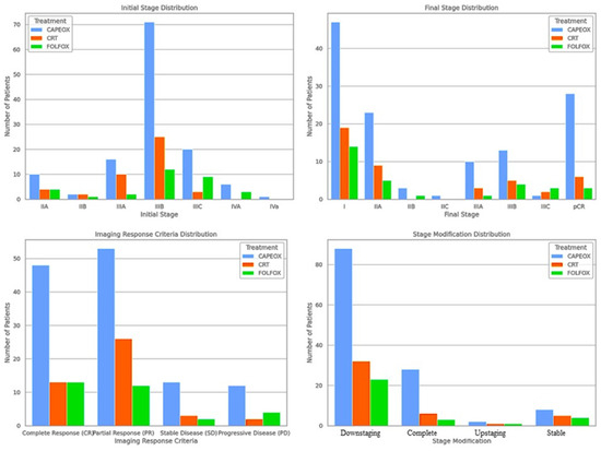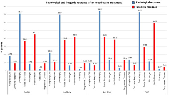 For this reason, the statistical analysis was descriptive, to provide a better understanding of the distributions for the initial and final stage, the imaging response, and the change in pathological stage within each treatment group (CAPEOX, FOLFOX, and CRT). From an imaging point of view, in patients treated with CAPEOX the results were as follows: complete response 13 patients (10.32%), progressive disease 12 patients (9.52%), partial response 48 patients (38.10%), and stable disease 53 patients (42.06%). In the case of the group treated with FOLFOX, it was observed that 2 patients (6.45%) had complete response, 4 patients (12.90%) progressive disease, 13 patients (41.94%) partial response, and 12 patients (38.71%) stable disease. In the case of the CRT group, 3 patients had complete response (6.82%), 2 patients progressive disease (4.55%), 13 patients partial response (29.55%), and 26 patients stable disease (59.09%). The descriptive analysis highlighted large differences between imaging and histopathological evaluation, after neoadjuvant treatment, both in the total group and in each treatment arm (Figure 3).
