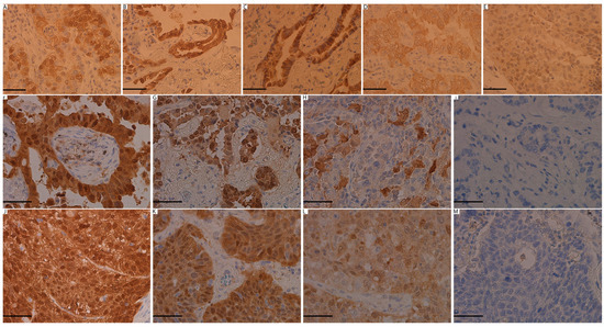 In total, 20 out of 100 cases were positive for p16INK4a expression. Of those, 12 cases were ADC (12/59, 20.3%), and 8 cases were SqCC (8/41, 19.5%). In both ADC and SqCC, p16INK4a expression varied from being strongly positive to aberrant to completely negative (Figure 1F–M). Cases with non-specific cytoplasmic staining were considered negative. Analysis of p16INK4a expression in correlation to the clinicopathological variables revealed a statistically significant association with the pathological stage (p = 0.029), where most of the cases with positive p16INK4a expression were either stage I or II. No significant association was demonstrated with the other characteristics, including HPV status (Table 1).