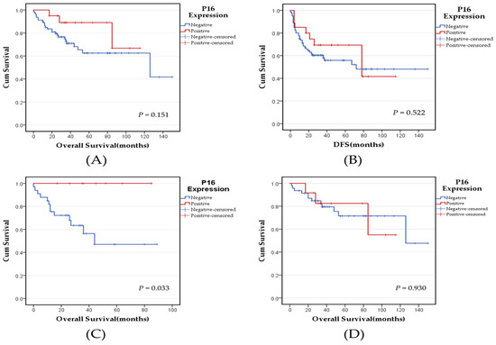 Categorical variables were summarized using counts and percentages. The Chi-square test or Fisher’s exact test was used in a univariate study to discover relationships between p16INK4a expression and clinicopathological features. The Kaplan–Meier method was used to estimate the OS and DFS, and the log-rank test was performed to compare the results. All statistical analyses were undertaken with a two-tailed test. The threshold for statistical significance was set at p-values less than or equal to 0.05. Statistical analysis was performed using IBM SPSS Statistics software for Windows version 29 (IBM Corp., New York, NY, USA).