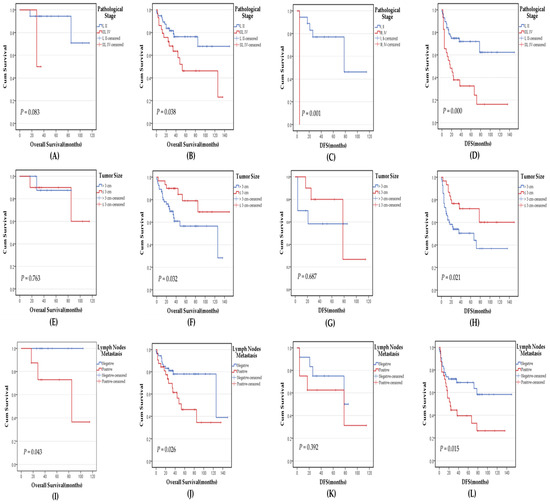 The median overall survival (OS) for all patients was 35 months (mean 43.45 months), and the median disease-free survival (DFS) was 26.5 months (mean 36.11 months) following surgical resection. Survival analysis of all cases showed no statistically significant association between p16INK4a expression and either OS (p = 0.151) or DFS (p = 0.522). However, by dividing the cases according to the histological subtypes, a statistically significant association was found between p16INK4a expression and OS in SqCC cases, where cases with positive p16INK4a expression exhibited a better overall survival (p = 0.033) but not in ADC cases (p = 0.930) (Figure 2A–D). Kaplan–Meier survival analysis showed that advanced pathological stages, positive lymph node metastasis, and tumor size > 3 cm were significantly associated with poor OS and DFS in p16INK4a negative cases. In contrast, in p16INK4a positive cases, only positive lymph node metastasis and advanced pathological stages were significantly associated with poor OS and DFS, respectively (Figure 3A–L).