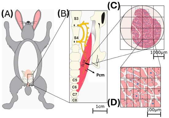 Sampling PFM myofibers. The female rabbit was placed in a supine position (A), and the Bsm and Pcm muscles were identified and excised (B); subsequently, they were histologically processed and cut at seven μm, and a section was taken from the medial region and stained. HE, photos were taken in the microscope at 50× to reconstruct the entire muscle, and the results were divided into 16 quadrants. Of said reconstruction of the muscle, two photos were taken at 40× for each quadrant (C). Each photo at 40× was divided into 24 quadrants, and each beech fiber was measured in the fifth quadrant (D). Blue asterisks indicate sampled myofibers.