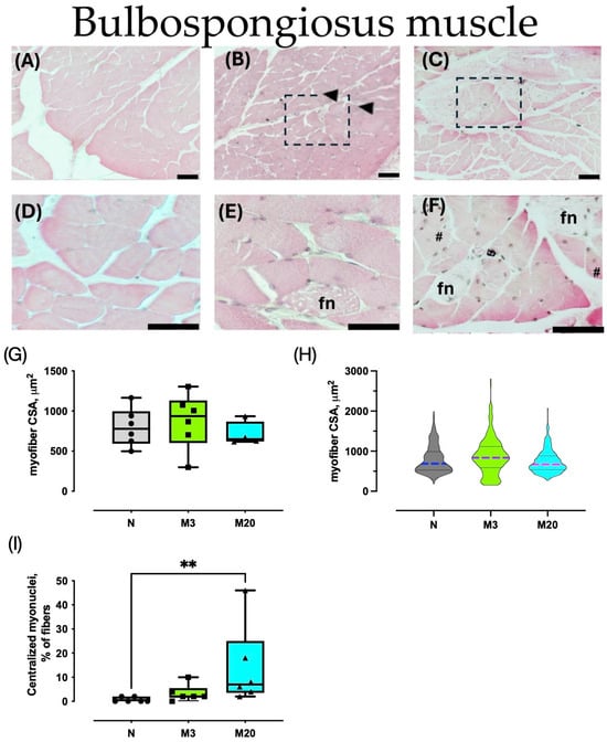 Morphometry of bulbospongiosus (Bsm) muscles of nulliparous (N) and multiparous rabbits at postpartum days 3 (M3) and 20 (M20). Representative images of hematoxylin-stained sections (A–F). Data are mean ± S.E.M., (G) or median and interquartile range (I). Violin plots represent the data of 300 myofibers (50 per animal) per group (n = 6 rabbits each) (H). Arrowhead, hypercontracted myofibers; fn, focal necrosis; dashed rectangle, PMN cells; #, internalized, and centralized myonuclei. Bar, 50 µm ((A–C) 100×; (D–F), 400×). **, p < 0.01.