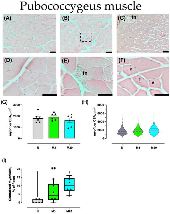 Morphometry of pubococcygeus (Pcm) muscles of nulliparous (N) and multiparous rabbits at postpartum days 3 (M3) and 20 (M20). Representative images of hematoxylin-stained sections (A–F). Data are mean ± S.E.M., (G) or median and interquartile range (I). Violin plots represent the data of 300 myofibers (50 per animal) per group (n = 6 rabbits each) (H). Representative images are shown. Arrowhead, hypercontracted myofibers; fn, focal necrosis; dashed rectangle, PMN cells; #, internalized, and centralized myonuclei. Bar, 50 µm ((A–C) 100×; (D–F), 400×). **, p < 0.01.