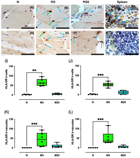 HLA-DR immunostaining in bulbospongiosus (Bsm); (A–C,I,J) and pubococcygeus (Pcm); (D–F,K,L) muscles of nulliparous (N) and multiparous (M) rabbits. Spleen sections from nulliparous rabbits were used as a positive control (G); the negative control was established using spleen sections in which the primary antibody was omitted (H). Data are median and interquartile range. **, p < 0.01; ***, p < 0.001. Blue arrows, HLA-DR-ir cells; green arrows, HLA-DR-ir-vacuoles Bar, 100 µm (600×).