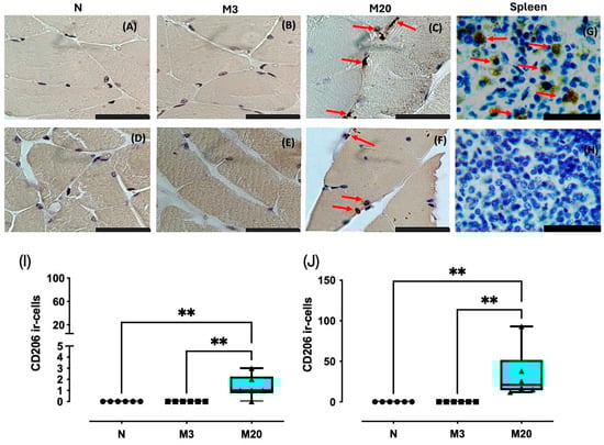 CD206 immunostaining in bulbospongiosus (Bsm); (A–C,I) and pubococcygeus (Pcm); (D–F,J) muscles of nulliparous (N) and multiparous (M) rabbits. Spleen sections from nulliparous rabbits were used as the positive control (G); the negative control was established using spleen sections in which the primary antibody was omitted (H). Data are median and interquartile range. **, p < 0.01. Red arrows, CD206-ir cells. Bar, 100 µm (600×).