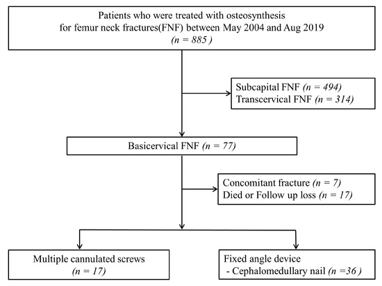 - Lee, Y.K.; Yoon, B.H.; Hwang, J.S.; Cha, Y.H.; Kim, K.C.; Koo, K.H. Risk factors of fixation failure in basicervical femoral neck fracture: Which device is optimal for fixation? Injury 2018, 49, 691–696. [Google Scholar] [CrossRef]