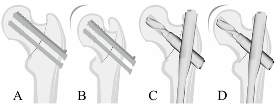 - Hoshino, C.M.; O’Toole, R.V. Fixed angle devices versus multiple cancellous screws: What does the evidence tell us? Injury 2015, 46, 474–477. [Google Scholar] [CrossRef]