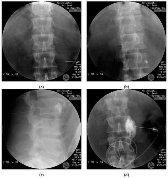 A needle was placed adjacent to the L2 vertebral body under the transverse processes in the oblique (a), anterior–posterior (b) plane under the guidance of fluoroscopy. After the administration of the contrast agent, needle placement was confirmed with lateral (c) and anterior–posterior (d) plane fluoroscopy.