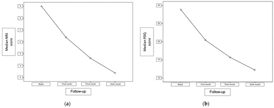 Graphical presentation of the median NRS (a) and PDQ (b) scores in follow-ups after the procedure (NRS: Numerical Rating Scale; PDQ: Pain Detect Questionnaire).