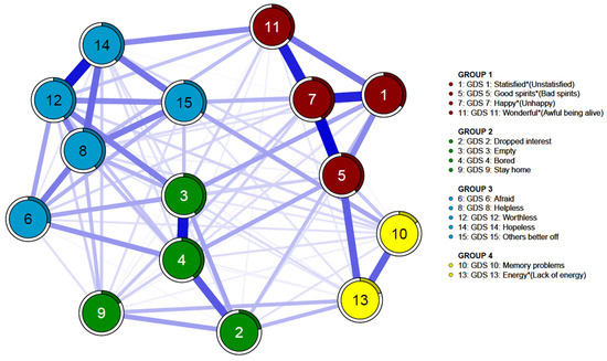 Network of GDS-15 items in patients with Alzheimer’s disease (n = 1889). Each node is linked with edges, which represent the strength between nodes. * For five items (items 1, 5, 7, 11, and 13), a response of “no” indicates the presence of the depressive symptoms.