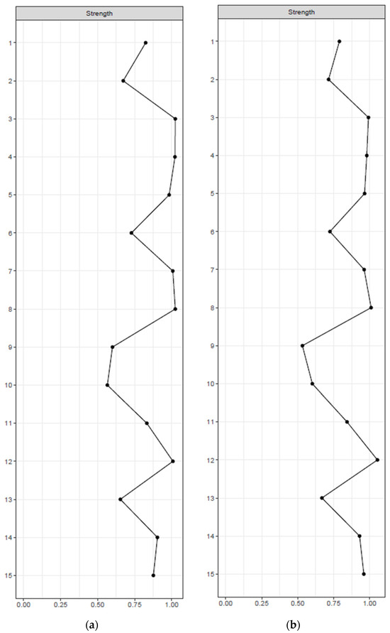 (a) Centrality indices of GDS-15 symptom items in patients with mild cognitive impairment. The x-axis represents standardized z-scores, and the y-axis represents symptom items. (b) Centrality indices of GDS-15 symptom items in patients with Alzheimer’s disease. The x-axis represents standardized z-scores, and the y-axis represents symptom items.