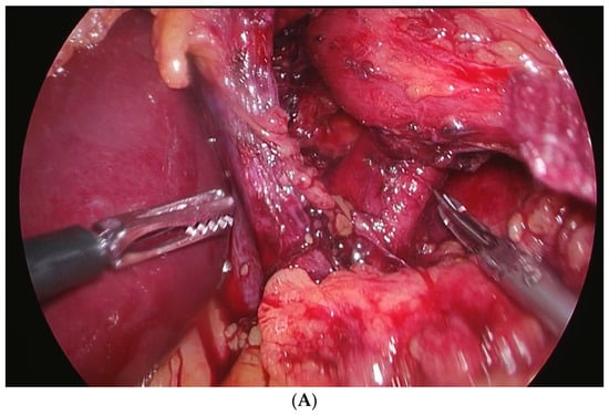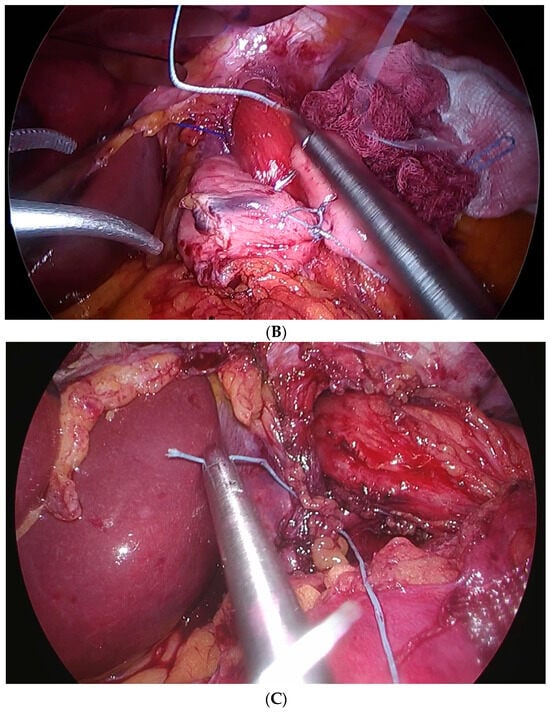 All patients underwent LNF surgery according to a standard procedure. All of the LNF surgeries were performed by the same team of experienced surgeons. In the years considered by this study, the department performed over 50 LNFs per year, which represented one of the largest number of procedures in the country. The patient was placed supine on the operating table with the lower limbs abducted in the anti-Trendelenburg position. Carbon dioxide was insufflated into the peritoneal cavity to a pressure of 12 mm Hg. The first 10 mm trocar was inserted in the midline, approximately 12 cm below the xiphoid process, then under the eye, 10 mm in the right axillary line below the costal arch (liver retractor), 5 mm in the right midclavicular line (dissector), 10 mm in the left mid-clavicular line (Cordless Ultrasonic Dissection System, Sonicision™, Medtronic, Dublin, Ireland), and 5 mm in the left anterior axillary line under the left costal arch (assistant). The LNF started with the dissection of the crura of the diaphragm and then the content of the mediastinum, as seen Figure 1A. The distal esophagus was mobilized to a length of approximately 5 cm into the abdominal cavity. Then, the crura were sutured behind the esophagus with two or three nonabsorbable sutures (polyfilament, PremiCron®/Dagrofil®, size 0, BBraun, Spain), as seen Figure 1B. A posterior 360° fundus wrap of 3 cm in length was performed using two or three nonabsorbable sutures (polyfilament, PremiCron®/Dagrofil®, size 2/0, BBraun, Spain), as seen in Figure 1C. A 36F bougie was inserted to check for any restrictions or difficulties in passage. Usually, no drains were left.