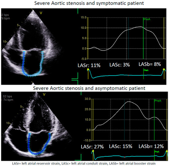 Specifically, LAS may offer unique utility in cases of asymptomatic moderate AS, since moderate AS is associated with poor prognosis [77]. Sonaglioni et al. studied a cohort of asymptomatic, moderate AS and followed them for CV hospitalization (CHF, ACS, arrhythmias), cardiac or sudden cardiac death, and found that preserved LASr was independently associated with a 15% lower risk of the composite outcome beyond the traditional risk factors [78]. LAS > 19% was identified as the cutoff with optimal sensitivity/specificity to predict CV events [78]. This finding highlights the importance of LAS in the risk stratification and procedural planning for a cohort of patients who were not traditionally identified as candidates for valvular intervention. Two example cases of severe AS with differential presentations are shown with Figure 3.