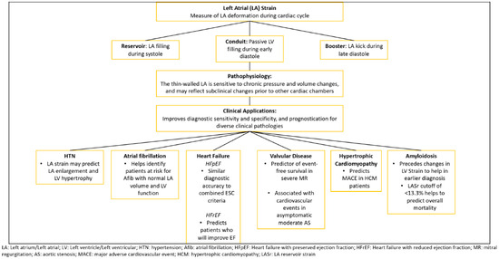 - Jain, V.; Ghosh, R.; Gupta, M.; Saijo, Y.; Bansal, A.; Farwati, M.; Marcus, R.; Klein, A.; Xu, B. Contemporary Narrative Review on Left Atrial Strain Mechanics in Echocardiography: Cardiomyopathy, Valvular Heart Disease and Beyond. Cardiovasc. Diagn. Ther. 2021, 11, 924–938. [Google Scholar] [CrossRef]
