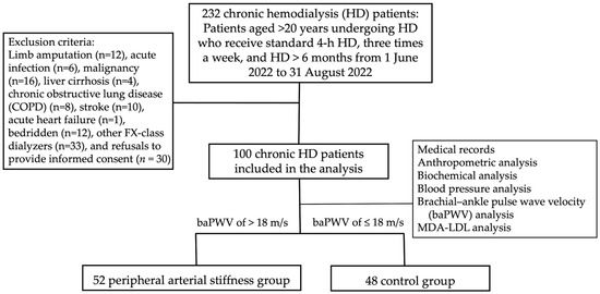 Flowchart of the selection of HD patients receiving measurements of both brachial-ankle pulse wave velocity and Malondialdehyde (MDA)-modified LDL.