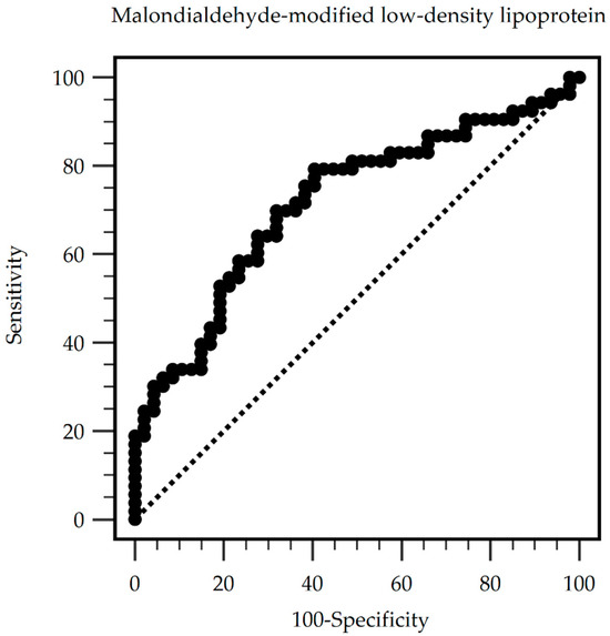 The mechanisms underlying the association between MDA-LDL and PAS in HD patients were likely multifactorial. MDA-LDL has been shown to promote endothelial dysfunction by increasing the expression of adhesion molecules, facilitating leukocyte recruitment, and impairing nitric oxide bioavailability [20,30,31]. Additionally, MDA-LDL may contribute to arterial stiffening by stimulating the proliferation and migration of vascular smooth muscle cells and promoting the synthesis of extracellular matrix components, such as collagen [13,32]. Moreover, the uremic milieu in ESRD patients may exacerbate the adverse effects of MDA-LDL on the arterial wall leading to accelerated arterial stiffening [33]. The ROC curve analysis identified a serum MDA-LDL level of 80.91 mg/dL as an optimal cut-off value for predicting the presence of PAS in our cohort of HD patients. Further prospective studies are needed to validate the predictive value of this cut-off level and to investigate the potential utility of serum MDA-LDL as a biomarker for risk stratification and management of PAS in HD patients.