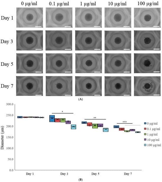 The Institutional Review Board of Seoul St. Mary’s Hospital, College of Medicine, The Catholic University of Korea examined and approved the current study protocol (KC22SISE0174 was approved on 5 April 2022 and KC24SISI0005 was approved on 16 January 2024). Gingiva-derived mesenchymal stem cells were obtained, and the cells were plated on a culture dish, and any cells that did not adhere to the dish were taken out []. Every 2 or 3 days, we switched to a new cultural media. We created stem cell spheroids using readily available concave microwells (H389600, StemFIT 3D; MicroFIT, Seongnam, Republic of Korea). Each well was filled with a total of 1 × 106 stem cells, and the cells’ reactions were then measured. We administered therapy to stem cell spheroids with tacrolimus at predetermined concentrations of 0 μg/mL, 0.1 μg/mL, 1 μg/mL, 10 μg/mL, and 100 μg/mL. On Days 1, 3, 5, and 7, we assessed the morphological traits.