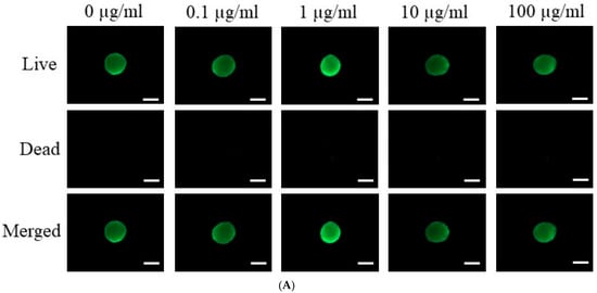 Figure 2A presents the results of a qualitative live/dead assay for stem cell spheroids grown in osteogenic media and treated with various concentrations of tacrolimus (0, 0.1, 1, 10, and 100 μg/mL). The assay, conducted on Day 7, employed a dual-fluorometric evaluation that differentiates live cells, which exhibit esterase activity and intact plasma membranes, from dead cells, which have compromised membrane integrity. In the live panel, spheroids across all concentrations emitted green fluorescence, suggesting robust esterase activity and intact cell membranes. The dead panel showed minimal to no red fluorescence, indicating few compromised cells across all treatment groups. The merged images corroborate these observations, with a predominance of green fluorescence and negligible red signal, implying high cell viability even at the highest concentration of tacrolimus. These results suggest that tacrolimus, up to a concentration of 100 μg/mL, does not significantly compromise the viability of stem cells within spheroids in osteogenic media after 7 days of treatment.