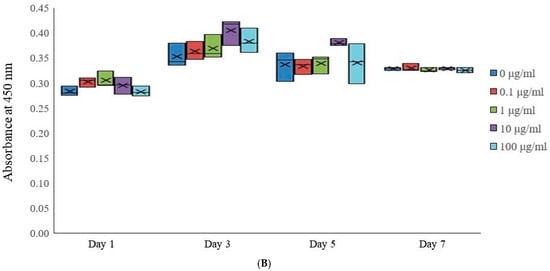 Cellular viability within stem cell spheroids subjected to various concentrations of tacrolimus (0, 0.1, 1, 10, and 100 μg/mL) was quantitatively assessed on Days 1, 3, 5, and 7 using the Cell Counting Kit-8 assay (Figure 2B). This assay employed a water-soluble tetrazolium salt, which is reduced by cellular dehydrogenase activities in viable cells to form a soluble formazan dye, quantifiable by measuring absorbance at 450 nm. On Day 1, spheroids across all tacrolimus concentrations exhibit similar median viability, as indicated by the comparable absorbance values. By Day 3, there was a slight variation in cell viability, with the 10 μg/mL concentration group showing an increase in mean and median absorbance. By Day 5, the 10 μg/mL concentrations indicate a more pronounced increase in absorbance, suggesting increased cellular viability. These results suggest a concentration-dependent impact of tacrolimus on the viability of cells within the spheroids, with a dose-dependent increase in cellular viability.