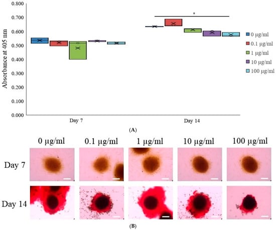 On Days 7 and 14, we evaluated calcium deposits using an anthraquinone dye assay to determine osteogenic differentiation []. After washing and fixing the stem cell spheroids, we dyed them with Alizarin Red S at room temperature for 30 min. Following the extraction, the bound dyes were quantified using cetylpyridinium chloride.