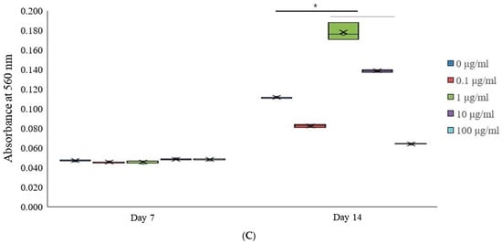 Calcium deposition within stem cell spheroids cultured in osteogenic media and treated with tacrolimus was quantitatively assessed on Days 7 and 14 (Figure 3C). After staining with Alizarin Red S (Sigma-Aldrich; Merck Millipore, Darmstadt, Germany), which binds to calcium deposits, the spheroids were processed to extract the bound dye. The extracted dye was quantified spectrophotometrically using cetylpyridinium chloride, with absorbance read at 560 nm, correlating with the amount of calcium-bound dye. On Day 7, there were no significant differences in calcium deposition among the different treatment groups, as indicated by the similar absorbance levels. However, by Day 14, there was a statistically significant increase in calcium deposition in the 1 and 10 μg/mL tacrolimus-treated group (indicated by the asterisk, *), as reflected by the higher mean and median absorbance. These findings indicate a concentration-dependent effect of tacrolimus on calcium deposition in stem cell spheroids.
