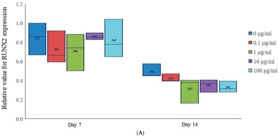On Day 7, the median expression levels of RUNX2 were relatively similar across all treatment groups (Figure 4A). However, by Day 14, there was a decrease in RUNX2 expression across all tacrolimus concentrations, with higher concentrations of tacrolimus showing a more pronounced downregulation.