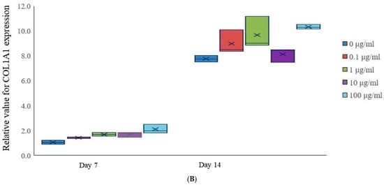 On Day 7, the expression of COL1A1 was relatively uniform across all treatment groups, with no significant differences (Figure 4B). However, by Day 14, there was an increase in COL1A1 expression across all tacrolimus concentrations, as evidenced by the elevated mean and median values, which may indicate enhanced osteogenic activity.