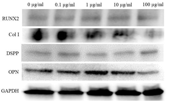 Cells were lysed in ice-cold radioimmunoprecipitation assay lysis and extraction buffer (Thermo Fisher Scientific, Inc., Waltham, MA, USA) according to the manufacturer’s protocols. Whole-cell lysates were quantified using the bicinchoninic acid assay (Thermo Fisher Scientific, Inc.). Protein samples were loaded and then transferred for immunoblotting. The membranes were incubated with the following primary antibodies overnight at 4 °C: anti-RUNX2, anti-collagen I, anti-RUNX2, anti-DSPP, anti-OPN, or anti-GAPDH antibody from Abcam Cambridge, UK, and Santa Cruz Biotechnology, Inc., Dallas, TX, USA. After washing, membranes were incubated with a secondary antibody from Santa Cruz Biotechnology, Inc. at room temperature.