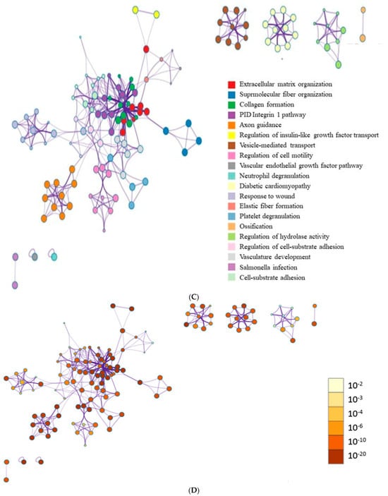 RNA sequencing. (A) A cluster map (a heatmap with hierarchical clustering) for osteoblast differentiation in tacrolimus-treated gingiva-derived stem cell spheroids. (B) Functional enrichment analysis. (C) Relationship between pathways (colored by cluster). (D) Relationship between pathways (colored by p value). (E) Gene expression profiling for regulation of osteogenic differentiation in tacrolimus-treated stem cell spheroids.