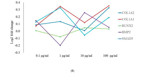 In our study, we analyzed the relative mRNA expression levels of RUNX2 and COL1A1 in stem cell spheroids cultured in osteogenic media and exposed to different concentrations of tacrolimus. RUNX2 is a key transcription factor in osteoblast differentiation and bone formation []. COL1A1 encodes the pro-alpha1 chains of type I collagen, a pivotal structural protein in the bone matrix and a critical marker for bone formation and osteogenic differentiation []. This research indicated that the expression of RUNX2 did not yield substantial outcomes related to osteogenic differentiation. Nevertheless, there was a surge in the expression of COL1A1 following the incorporation of tacrolimus. It was reported that COL1A1 was significantly involved in the osteogenic differentiation of mesenchymal stem cells []. COL1A1 provides a structural framework in the extracellular matrix of bone, facilitating the deposition of calcium phosphate to form bone mineral []. COL1A1 interacts with various signaling pathways that are essential for stem cell differentiation including the bone morphogenetic protein signaling pathway []. It was suggested that materials that incorporate COL1A1 can enhance the osteogenic differentiation of stem cells, promoting bone regeneration in clinical applications by mimicking the natural extracellular matrix [,].