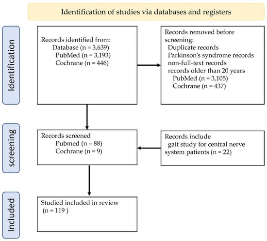 This study analyzed common treatments and training methods for walking training applied in patients with Parkinson’s disease (PD) based on articles sourced from the PubMed and Cochrane databases. Initially, 3193 studies from PubMed and 446 from Cochrane were reviewed. Studies on Parkinson’s syndrome that were not full texts, over 20 years old, or had duplicate data were excluded. Additionally, 22 studies related to walking training applied to central nervous system patients were added, resulting in a total of 119 studies being used to compare treatment methods for PD. The above content is summarized and depicted in Figure 1.