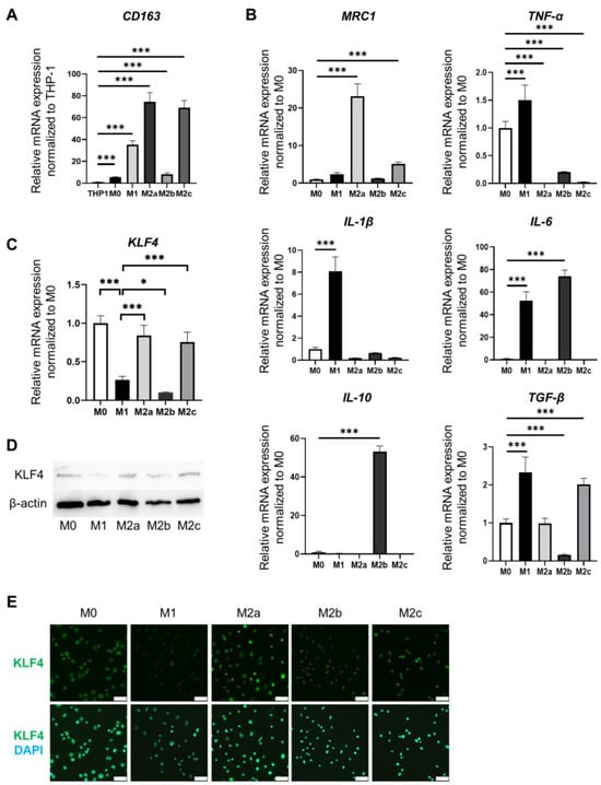 Phenotypes of each subtype of macrophages and differences in KLF4 expression. The mRNA expression levels were normalized to those of GAPDH. (A). Relative mRNA expression of CD163 in THP-1 cells and each macrophage subtype. The mRNA levels were expressed relative to the mean value of THP1; mean ± SD; n = 6. Statistical analysis was performed using two-tailed Dunnett’s test; *** p < 0.001. (B). Relative mRNA expression of MRC1, TNF-α, IL-1β, IL-6, IL-10, and TGF-β in each macrophage subtype. The mRNA levels were expressed relative to the mean value of M0; mean ± SD; n = 6. Statistical analysis was performed using two-tailed Dunnett’s test; *** p < 0.001. (C). Relative mRNA expression of KLF4 in each macrophage subtype. The mRNA levels were expressed relative to the mean value of M0; mean ± SD; n = 6. Statistical analysis was performed using two-tailed Dunnett’s test; * p < 0.05, *** p < 0.001. (D). Protein expression of KLF4 in each macrophage subtype assessed by Western blotting. (E). Immunofluorescence staining for KLF4 (green) in each macrophage subtype. Nuclei were counterstained with DAPI (blue). Scale bars: 50 µm. DAPI, 4′,6-diamidino-2-phenylindole.