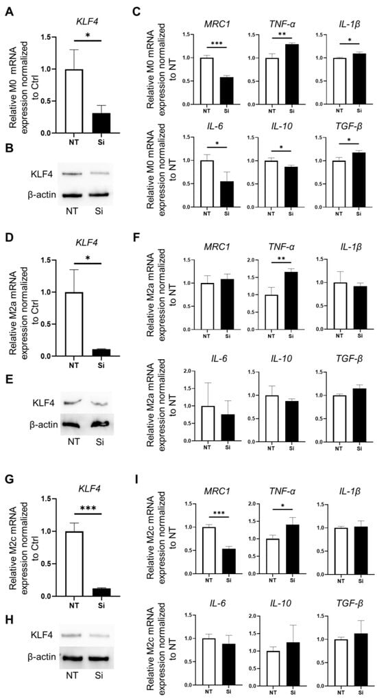 Phenotypic changes resulting from KLF4 knockdown in polarized macrophages: M0 cells (A–C), M2a cells (D–F), and M2c cells (G–I). (A). Relative expression of KLF4 mRNA in M0 cells. KLF4 was effectively silenced using siRNA. Relative expression of KLF4 mRNA was significantly decreased in the Si compared with the NT (p < 0.05); mean ± SD; n = 3. Statistical analysis was performed using two-tailed Student’s t-test; * p < 0.05. (B). Relative expression of KLF4 protein in KLF4-knockdown M0 cells assessed by Western blotting. (C). Relative expression of MRC1, TNF-α, IL-1β, IL-6, IL-10, and TGF-β mRNA in KLF4-knockdown M0 cells; mean ± SD; n = 3. Statistical analysis was performed using two-tailed Student’s t-test; * p < 0.05, ** p < 0.01, *** p < 0.001. (D). Relative expression of KLF4 mRNA. KLF4 expression in M2a cells was effectively silenced using siRNA. KLF4 expression was significantly decreased in the Si compared with the NT (p < 0.05); mean ± SD; n = 3. Statistical analysis was performed using two-tailed Student’s t-test; * p < 0.05. (E). Relative expression of KLF4 protein in KLF4-knockdown M2a cells assessed by Western blotting. (F). Relative expression of MRC1, TNF-α, IL-1β, IL-6, IL-10, and TGF-β mRNA in KLF4-knockdown M2a (Si M2a) cells. Relative expression of TNF-α mRNA was significantly elevated in the Si M2a compared with the NT M2a cells (p < 0.01); mean ± SD; n = 3. Statistical analysis was performed using two-tailed Student’s t-test; ** p < 0.01. (G). Relative expression of KLF4 mRNA in M2c cells was effectively silenced using siRNA. Relative expression of KLF4 mRNA was significantly decreased in Si M2c cells compared with NT M2c cells (p < 0.001); mean ± SD; n = 3. Statistical analysis was performed using two-tailed Student’s t-test; *** p < 0.001. (H). Relative expression of KLF4 protein in KLF4-knockdown M2c cells assessed by Western blotting. (I). Relative expression of MRC1, TNF-α, IL-1β, IL-6, IL-10, and TGF-β mRNA in KLF4-knockdown M2c cells; mean ± SD; n = 3. Statistical analysis was performed using two-tailed Student’s t-test; * p < 0.05, *** p < 0.001. Ctrl: control, NT: macrophages silenced by non-targeting control siRNA, Si: macrophages silenced by KLF4-siRNA.