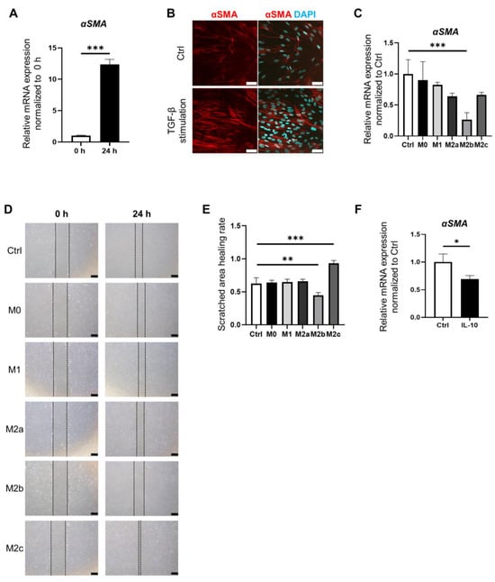 Macrophage subtypes modulate intestinal fibrosis. (A). IMFs were activated by stimulation with TGF-β for 24 h. Relative expression of αSMA mRNA in IMFs at 0 h and 24 h. Relative expression of αSMA mRNA in IMFs was significantly increased at 24 h compared with 0 h (p < 0.001); mean ± SD; n = 3. Statistical analysis was performed using two-tailed Student’s t-test; *** p < 0.001. (B). Immunofluorescence staining for αSMA (red) in control IMFs and IMFs stimulated with TGF-β for 24 h. Nuclei were counterstained with DAPI (blue). Scale bars: 50 µm. (C). IMFs were cultured with a conditioned medium prepared from the culture supernatant of each macrophage subtype. The expression of αSMA was significantly decreased in IMFs cultured with M2b medium compared with the control (blank; RPMI with 1% FBS) (p < 0.001); mean ± SD; n = 3. Statistical analysis was performed using two-tailed Dunnett’s test; *** p < 0.001. (D). Macroscopic images at 0 h and 24 h of scratch-wound healing assay results. IMFs were cultured with conditioned medium prepared from culture supernatant of each macrophage subtype. Scale bars: 500 µm. (E). Scratched area healing rate of scratch-wound healing assay. Scratched wound area was measured at 0 h and 24 h. Scratched area healing rate was calculated as (scratched area at 0 h—scratched area at 24 h)/(scratched area at 0 h) using ImageJ software 1.54. The scratched area healing rate was significantly decreased in IMFs cultured with the M2b medium compared with the control (p < 0.05). The scratched area healing rate was significantly increased in IMFs cultured with M2c medium compared with the control (p < 0.01); mean ± SD; n = 3. Statistical analysis was performed using two-tailed Dunnett’s test; ** p < 0.01, *** p < 0.001. (F). Relative expression of αSMA mRNA in IMFs supplemented with IL-10. The expression of αSMA was significantly decreased in IMFs supplemented with IL-10 compared with the control (p < 0.05). mean ± SD; n = 3. Statistical analysis was performed using two-tailed Student’s t-test; * p < 0.05. Ctrl: control.