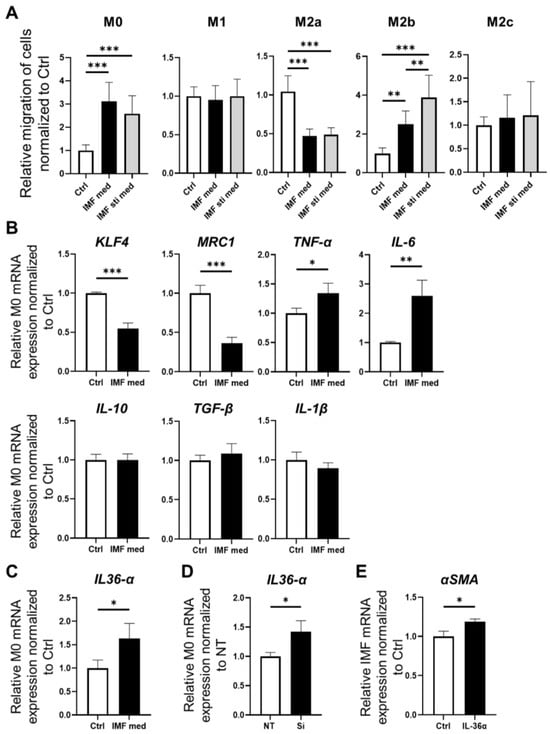 Interactions between macrophages and fibrosis in the presence of IMFs. (A). Migratory capacity of macrophages was analyzed using a Transwell migration assay. Macrophages were co-cultured with IMFs (IMF-med) or activated IMFs stimulated with TGF-β (IM-sti-med). The number of migrated M0 cells was significantly increased in IMF-med and IMF-sti-med compared with the blank control (IMF-med and IMF-sti-med vs. Ctrl, p < 0.001). The number of migrated M2a cells was significantly decreased in both IMF-med and IMF-sti-med compared with the blank control (p < 0.001). The number of migrated M2b cells was significantly increased in IMF-med and IMF-sti-med compared with the blank control (p < 0.001); mean ± SD; n = 9. Statistical analysis was performed using Tukey’s test; ** p < 0.01, *** p < 0.001. (B). Relative expression of KLF4, MRC1, TNF-α, IL-6, IL-10, TGF-β, and IL-1β mRNA in M0 cells cultured with the IMF supernatant. Relative expression of KLF4 mRNA was significantly decreased in M0 cells cultured with the IMF supernatant compared with the blank control (p < 0.001). Relative expression of MRC1 mRNA was significantly decreased in M0 cells cultured with the IMF supernatant compared with the control (p < 0.001). Relative expression of TNF-α mRNA was significantly increased in M0 cells cultured with the IMF supernatant compared with the control (p < 0.05). Relative expression of IL-6 mRNA was significantly increased in M0 cells cultured with the IMF supernatant compared with the control (p < 0.01); mean ± SD; n = 3. Statistical analysis was performed using two-tailed Student’s t-test; * p < 0.05, ** p < 0.01, *** p < 0.001. (C). Relative expression of IL-36α mRNA in M0 cells cultured with the IMF supernatant. The expression of IL-36α mRNA was significantly increased in M0 cells cultured with the IMF supernatant compared with the blank control (p < 0.05); mean ± SD; n = 3. Statistical analysis was performed using two-tailed Student’s t-test; * p < 0.05. (D). Relative expression of IL-36α mRNA in normal M0 (control) and KLF4-knockdown M0 cells. The expression of IL-36α increased significantly in the Si compared with the NT (p < 0.05); mean ± SD; n = 3. Statistical analysis was performed using two-tailed Student’s t-test; * p < 0.05. (E). Relative expression of αSMA mRNA in normal IMFs (control) and IMFs supplemented with IL-36α. The expression of αSMA was significantly increased in IMFs supplemented with IL-36α compared with the control (p < 0.05); mean ± SD; n = 3. Statistical analysis was performed using two-tailed Student’s t-test; * p < 0.05. Ctrl: control, NT: macrophage was silenced by non-targeting control siRNA, Si: macrophage was silenced by KLF4-siRNA macrophage.