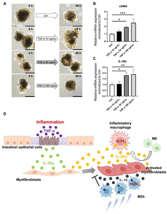 Analysis in an ex vivo model reconstituting IBD using HIOs. (A). Macroscopic images of organoids stimulated with TNF-α. Scale bars: 500 µm. (B). Relative expression of αSMA mRNA in control organoids (without TNF-α addition) and organoids supplemented with TNF-α at 30 ng/mL and 100 ng/mL. Relative expression of αSMA mRNA was significantly increased in the TNF-α 30 ng/mL and TNF-α 100 ng/mL groups compared with the control (p < 0.05 and p < 0.001, respectively); mean ± SD; n = 3. Statistical analysis was performed using two-tailed Dunnett’s test; * p < 0.05, *** p < 0.001. (C). Relative expression of IL-36γ mRNA in control organoid and organoids supplemented with TNF-α at each concentration. Relative expression of IL-36γ mRNA was significantly increased in the 30 ng/mL and 100 ng/mL groups compared with the control (p < 0.05 and p < 0.01, respectively); mean ± SD; n = 3. Statistical analysis was performed using two-tailed Dunnett’s test; * p < 0.05, ** p < 0.01. (D). Interactions between the small intestinal epithelium, intestinal stromal myofibroblasts, and macrophages and cytokines involved in intestinal inflammation and fibrosis. Ctrl: control, HIOs: human-induced pluripotent stem cell-derived small intestinal organoids, IBD: inflammatory bowel disease.