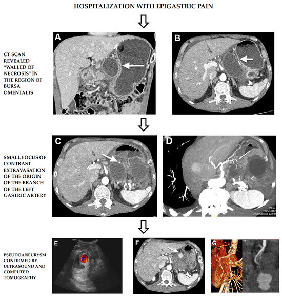 Well-defined cystic mass in the region of bursa omentalis—WON (A,B). Small focus of contrast extravasation suspected on pseudoaneurysm formation (C,D). Yin-yang sign on abdominal ultrasound with CD corresponding to turbulent blood flow in formed pseudoaneurysm (E). CT presentation of pseudoaneurysm originating from left gastric artery within WON (F,G).