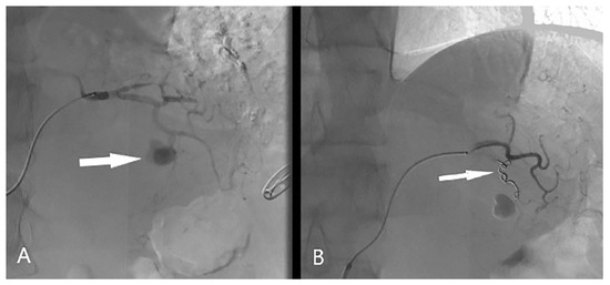 - Kim, J.; Shin, J.H.; Yoon, H.K.; Ko, G.Y.; Gwon, D.I.; Kim, E.Y.; Sung, K.B. Endovascular intervention for management of pancreatitis-related bleeding: A retrospective analysis of thirty-seven patients at a single institution. Diagn. Interv. Radiol. 2015, 21, 140–147. [Google Scholar] [CrossRef] [PubMed]