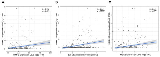 3.7. Effect of HOXB13 Silencing on MMP9, E2F1, and MEIS1 mRNA Expression