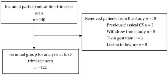 This prospective investigation was performed at the Hospital of Lithuanian University of Health Sciences Kaunas Clinics, Lithuania, by approval from Kaunas regional bioethics committee (protocol no. BE-10-15) []. The trial was registered on 18 March 2019 (Australian New Zealand Clinical Trials Registry, No. ACTRN12619000435189 (http://www.ANZCTR.org.au/ACTRN12619000435189.aspx, accessed on 18 March 2019). Between March 2019 and October 2020, 140 patients were included. All participants signed an informed consent form. We included women over 18 years with a singleton pregnancy after one or more previous low-transverse CSs. The datasets used during the study are accessible from the corresponding author upon reasonable request. Three women with twin gestations were excluded from the study, and two women were removed after previous classical CS. Eight participants were lost to follow-up; five patients were removed from the study after the first-trimester ultrasound scan, and, in the end, there were 122 patients (Figure 1) [].