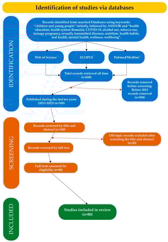 According to the study protocol, in PubMed, we used the database’s advanced search builder. We performed the search using MeSH terms with the main keywords “children and young people” initially, followed by AND/OR and “health education, health system Romania, COVID-19, alcohol use, tobacco use, teenage pregnancy, sexually transmitted diseases, nutrition, healthy habits, oral health, mental health, wellness, well-being”. Additionally, in Web of Science, we used the same keywords with the following filters applied: “randomised case-control, cross-sectional studies, interventional studies, on Humans, in the last ten years”.