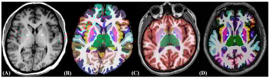 - Fischl, B.; Salat, D.H.; Busa, E.; Albert, M.; Dieterich, M.; Haselgrove, C.; van der Kouwe, A.; Killiany, R.; Kennedy, D.; Klaveness, S.; et al. Whole brain segmentation: Automated labeling of neuroanatomical structures in the human brain. Neuron 2002, 33, 341–355. [Google Scholar] [CrossRef]
