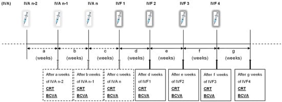 The CRT, BCVA (logMAR), and periods (mean ± standard error of the means) until the evaluation of the effects after the second-to-last IVA (IVAn-2) were 421 ± 29 µm, 0.312 ± 0.055, and 8.55 ± 0.54 weeks, respectively. After the first-to-last IVA (IVAn-1), the values obtained were 446 ± 22 µm, 0.319 ± 0.052, and 9.34 ± 0.52 weeks, respectively. After the last IVA (IVAn), first IVF (IVF1), second IVF (IVF2), third IVF (IVF3), and fourth IVF (IVF4), the values obtained were 432 ± 26 µm, 0.347 ± 0.058, and 8.28 ± 0.44 weeks; 431 ± 26 µm, 0.328 ± 0.062, and 7.14 ± 0.40 weeks; 413 ± 26 µm, 0.339 ± 0.062, and 7.48 ± 0.42 weeks; 389 ± 27 µm, 0.312 ± 0.064, and 8.17 ± 0.41 weeks; and 379 ± 32 µm, 0.280 ± 0.054, and 8.66 ± 0.50 weeks, respectively (Figure 2, Figure 3 and Figure 4).
