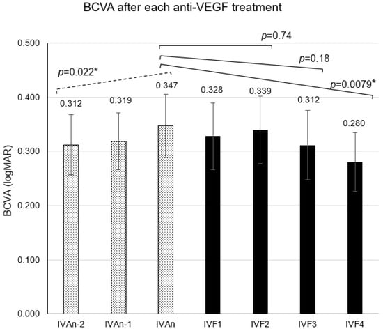 When the clinical course of BCVA (LogMAR) from IVAn-2 to IVAn during IVA treatment was analyzed, a significant trend of worsening was found (p = 0.022). On the other hand, analysis from IVAn to IVF4 after switching to IVF showed a significant BCVA improvement (p = 0.0079). Analysis of BCVA from IVAn to IVF3 and from IVAn to IVF2 showed no significant changes (p = 0.18, 0.74).