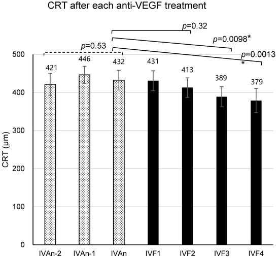 The mean central retinal thickness (CRT) after the n-2nd intravitreal injection of aflibercept (IVAn-2) to the 4th intravitreal injection of faricimab (IVF4). The effect after each injection is measured at the time of the subsequent injection. The mean CRT values were 421 ± 29 µm after IVAn-2, 446 ± 22 µm after IVAn-1, 432 ± 26 µm after IVAn, 431 ± 26 µm after IVF1, 413 ± 26 µm after IVF2, 389 ± 27 µm after IVF3, and 379 ± 32 µm after IVF4. Error bars represent standard error of the mean (SEM). *: This value means p < 0.05 in mixed-effects model.