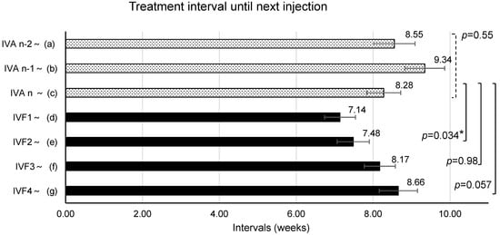 When the interval from IVAn-2 to IVAn during IVA treatment was analyzed, no significant changes were found (p = 0.55). Analysis of the treatment interval from IVAn to IVF2 after switching to IVF showed a significant shortening (p = 0.034), but no significant change was observed from IVAn to IVF3 (p = 0.98) and IVAn to IVF4 (p = 0.057).