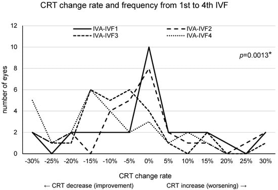 This figure shows the change rate of the central retinal thickness (CRT) after IVF1 to IVF4 compared with that after the final intravitreal injection of aflibercept (IVAn). The vertical axis plots the number of eyes, with the number of eyes at 0% representing the number of eyes with a −5% to 5% change in CRT compared to CRT after the final IVA. Only minimal change was observed in the CRT after the first intravitreal injection of faricimab (IVF1) compared with that after the IVAn. Conversely, in many eyes, the CRT after IVF4 decreased compared with that after IVAn. CRT decreased gradually but significantly over the course of four IVF treatments (p = 0.0013, mixed-effects model). *: This value means p < 0.05 in mixed-effects model.