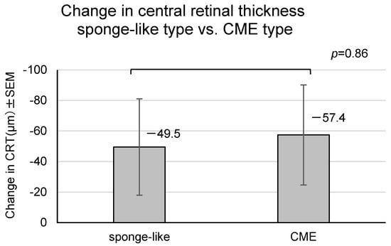 Upon transitioning from IVA to IVF or within 12 weeks after the last recurrence of macular edema, macular edema was divided into three types []: sponge-like (n = 14), cystoid macular edema (CME) (n = 15), and serous retinal detachment (n = 0). The variations in CRT from IVAn to IVF4 were compared between the sponge-like and CME types. The change in CRT of the sponge-like type was −49.5 ± 31.5 µm, showing no significant difference from that of the CME type (−57.4 ± 24.0 µm) (Figure 6, p = 0.86, Student’s t-tests). These results indicated that the type of macular edema was not correlated with the effect of IVF treatment on macular edema after switching from IVA.
