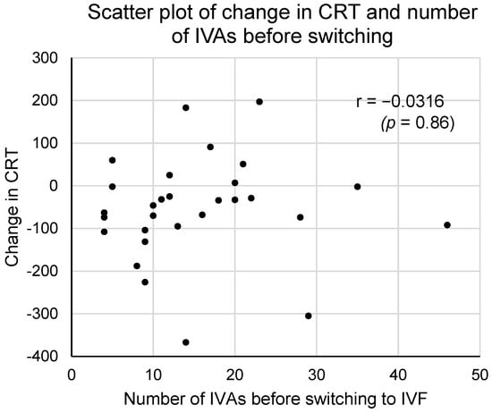 The average number of IVAs performed before switching to IVF was 15.4 ± 9.7 (mean ± standard deviation), with a range of 4 to 46 and a median of 13 (Table 1). In this study, the number of IVAs before switching varied considerably, ranging from 4 to 46, which may have influenced the effectiveness after switching to IVF. A smaller number of IVAs might suggest that the observed effect is not due to the difference between the effects of IVA and IVF but rather because a limited amount of IVA treatment is not sufficiently effective, and the effect becomes apparent after switching to IVF. However, no significant correlation was observed between the number of IVAs before switching to IVF and the change in CRT after switching to IVF (from CRT after IVF4 to CRT after IVAn) (Figure 7, Pearson product–moment correlation coefficient: −0.0316). The efficacy of switching to IVF was not significantly influenced by the number of IVAs administered prior to switching. It cannot be conclusively stated that IVF was solely effective due to the smaller number of IVAs.